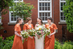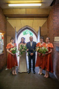 This was a large wedding requiring three of us working a long day on floral prep, but we absolutely loved every moment of it. Flowers for the day included bouquets, buttonholes, a decorated church door/archway, hanging flowers within the church, reception table flowers, and multiple vessels bursting with summer blooms.